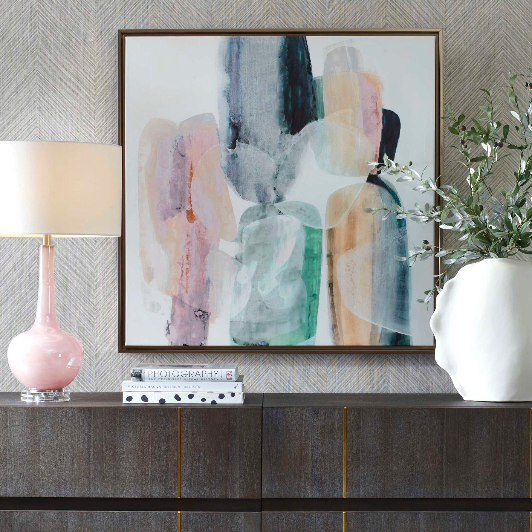 The Mood Elevator Framed Canvas Uses Soft, Uplifting Pastel Hues Contrasted With Pops Of Midnight Blue To Embody The Lightness And Joy Of Positive Emotions. Surrounded By A Simple Gallery Frame In Bronze Gold Finish, This Piece May Be Hung Horizontal Or Vertical. Each Canvas Is Proudly Handcrafted And Printed In The USA. Artwork By Liz Jardine.