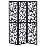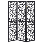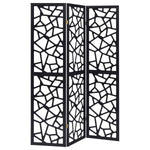 Make a bold statement in any space with this 3-panel room divider, featuring an eye-catching mosaic cutout pattern that enhances modern and mid-century décor. The sleek black finish creates a striking contrast, while the open geometric design allows light to pass through, maintaining an airy and spacious feel. Crafted with a durable solid wood frame, this partition is perfect for separating spaces, adding privacy, or serving as a decorative accent. Its folding trifold design offers versatility, making it easy to reposition as needed.
