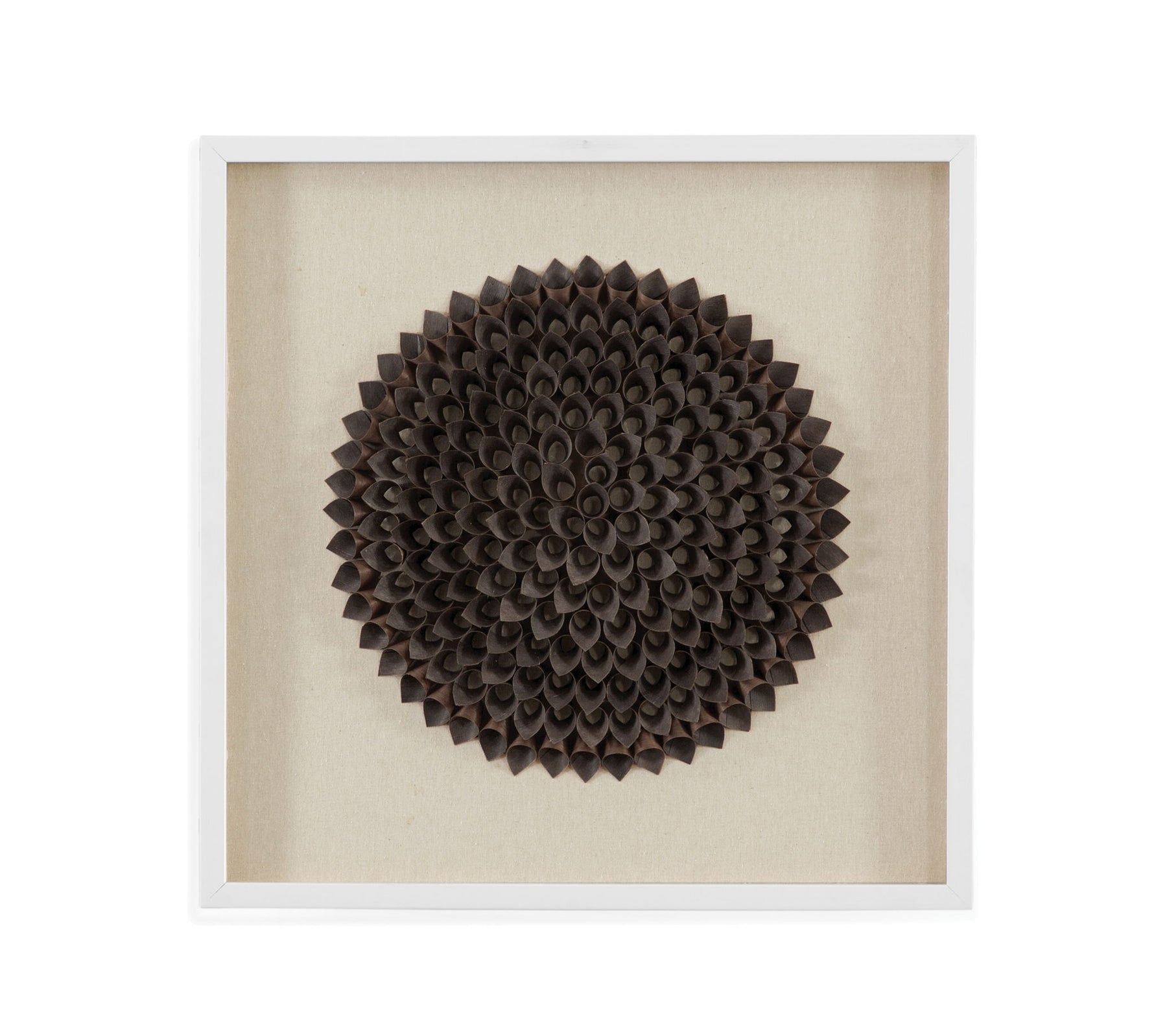 Nature Wall Art is a shadow box accentuated with a linen-like oatmeal colored mat and a floral pattern of rolled cutouts of natural fibers and white modern frame. PS. 7.27 LBS.
