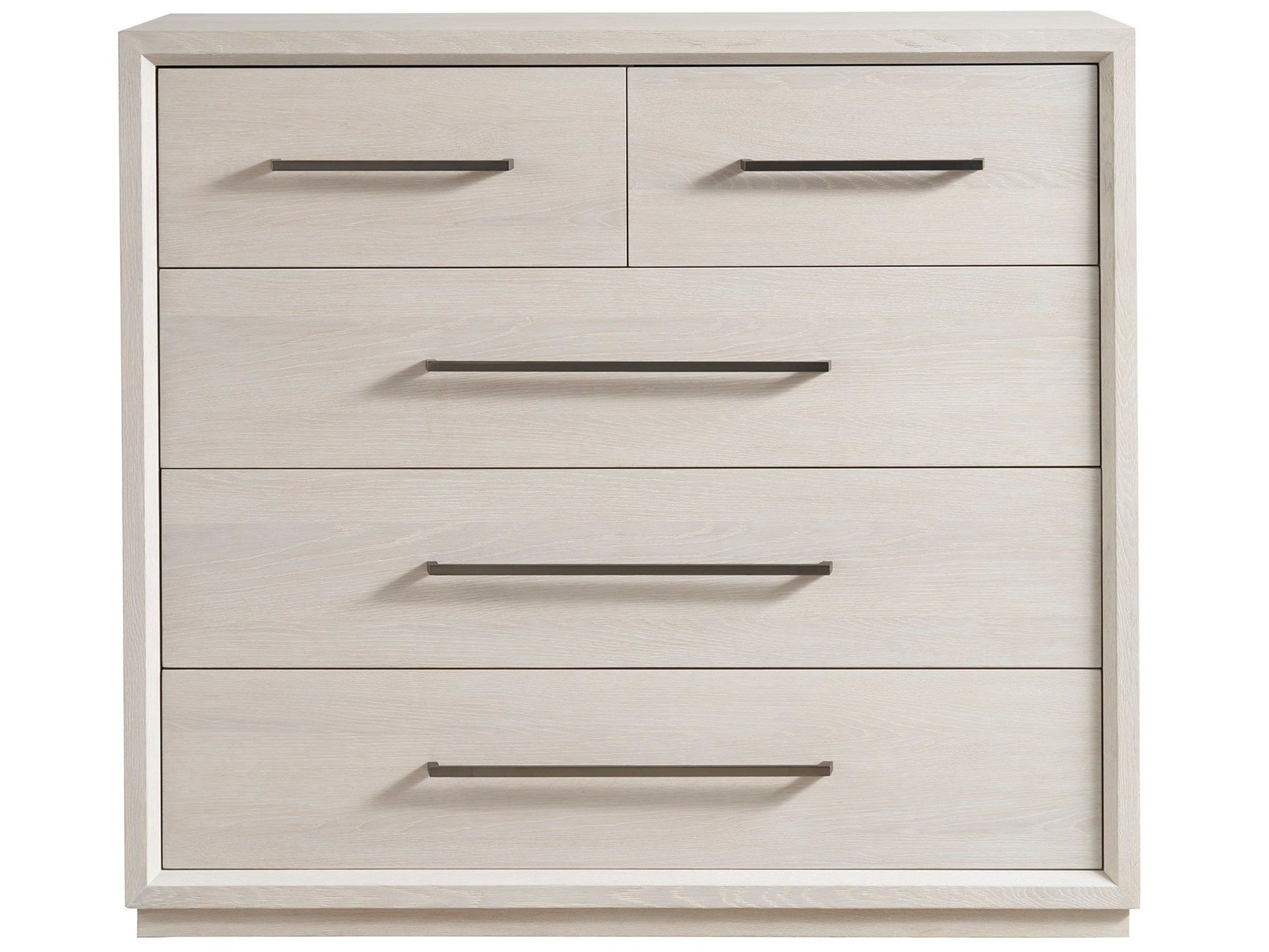 The Astrid Drawer Chest stands tall with five drawers, embodying a sleek and breezy modernity in a gorgeous neutral White Oak finish. Its stature is gracefully accentuated by long, chic bronzed pull hardware, adding a touch of sophistication to this functional piece. The chest's design strikes a balance between contemporary flair and timeless elegance, making it a versatile addition to any modern bedroom.