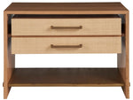 Unit price perThe Jonah Nightstand captures the essence of mid-century modern charm with its two-tonal aesthetic, blending light and dark brown hues. This piece features raffia drawer faces, complemented by elegant gold hardware and framed with an oak top and sides, creating a harmonious balance of texture and color.