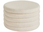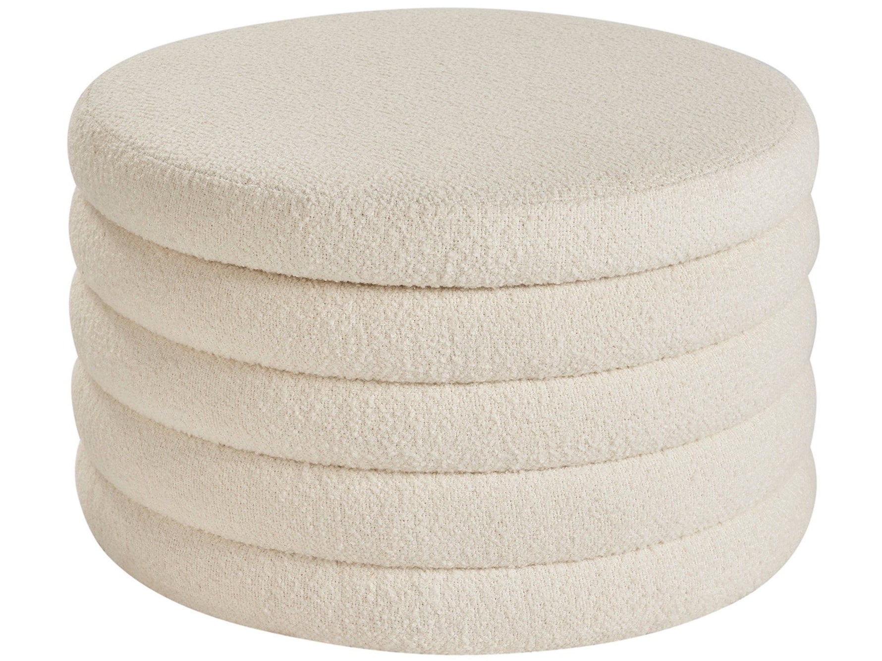 Unit price perThe Obi Storage Ottoman is a fully rounded, functional masterpiece upholstered in the soft Berber Snow fabric. Its top lid reveals convenient inside storage, while five casters ensure mobility. The oversized horizontal tufting detail adds a rich, textural dimension to its fully upholstered body, making it a plush, visually engaging piece perfect for adding comfort and style to any room.