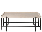 Unit price perThe Theron Cocktail Table artfully juxtaposes light and dark, featuring a serene, lighter Travertine rectangular top that gracefully contrasts with a clean-lined bronze metal base. This modern ensemble captivates with its visually appealing design, blending simplicity with a striking interplay of hues for a compelling centerpiece in any contemporary space.
