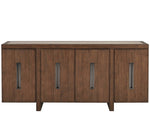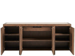 The Veda Credenza, in a bold Medium Brown Oak finish, commands attention with its four doors and interior adjustable shelving, designed for versatility. The innovative design integrates pulls directly into the doors, creating a seamless, illusionary effect that enhances the credenza's sleek and modern appeal. This piece is a perfect blend of functionality and artistic design, making a striking addition to any space.