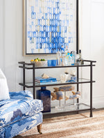 - Hammered Metal Frame With Flared Feet In A Textured Finish, 3 Inset Tempered Glass Shelves.