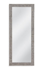 The Newton floor mirror showcases an eye-catching Greek key design crafted from natural and black colored bone, lending it a distinct boho flair. Its intricate geometric pattern adds a touch of sophistication to any space, while the black and natural off-white color palette ensures versatility in complementing various decor styles. Elevate your home decor with the timeless charm and artistic appeal of the Newton floor mirror, perfect for adding both style and functionality to your living space.