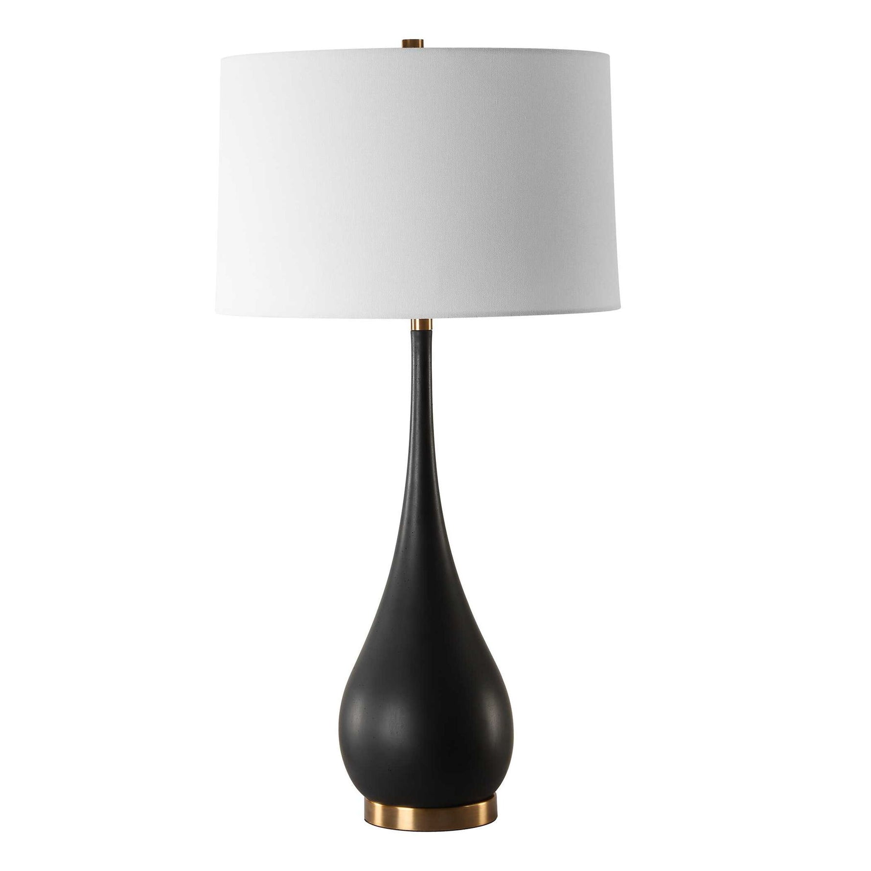 This Exquisite Table Lamp Features A Tear-drop Shaped Base Handcrafted From Sleek, Man-made Black Stone. Accentuated With Brass-plated Details, It Exudes Sophistication And Modern Elegance. The Slightly Tapered Round Hardback Shade Is A Crisp White Linen Fabric.