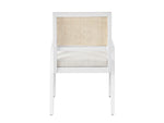 The Cane Back Arm Chair brings subtle bohemian vibes to home interiors with its striking pairing of materials, including a woven cane back, a crisp white body and a plush upholstered seat cushion.