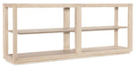 Unit price perA brilliant blend of materials, the Nouveau Chic Rectangle Console Table combines Oak Veneers, tempered glass and a metal frame. The beveled-edge glass top looks down onto the middle wood shelf and bottom shelf featuring a dramatic sunburst veneer pattern. Finished in the serene Sandstone finish with light wire brushing for tactile appeal. With a slim 16-inch depth, this piece adds design and function to even tight spaces.