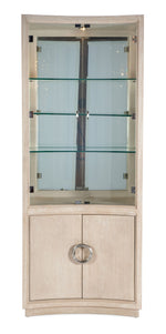 In a striking soft modern silhouette, the Nouveau Chic Display Cabinet is crafted of Cathedral and Quartered Oak Veneers with light wire brushing, finished with the serene Sandstone finish. Fashion fuses with function, with two tempered glass doors on top and two wood doors with soft-close hinges and magnetic catches on the bottom. There’s one self-closing drawer behind the bottom set of doors, three adjustable glass shelves with plate grooves behind the glass doors, one adjustable wood shelf behind the bottom doors and a mirror back panel in the top section. Features a puck light with 3-intensity touch switch on the right side panel.