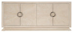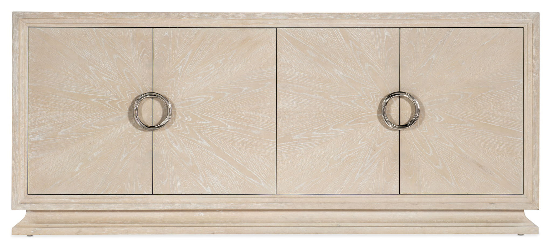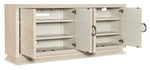 Unit price perA brilliant fusion of classic architectural elements, movement of soft angles and a serene Sandstone finish on Cathedral and Quartered Oak Veneers, the Nouveau Chic Entertainment Console pairs calm chic style with function. Accommodating up to an 80 inch TV, the console has 4 doors with soft-close hinges and magnetic door catches with two adjustable wood shelves behind each pair of doors. Includes a 3-plug outlet behind the right-side doors and a ventilated back panel.