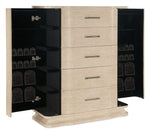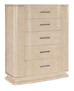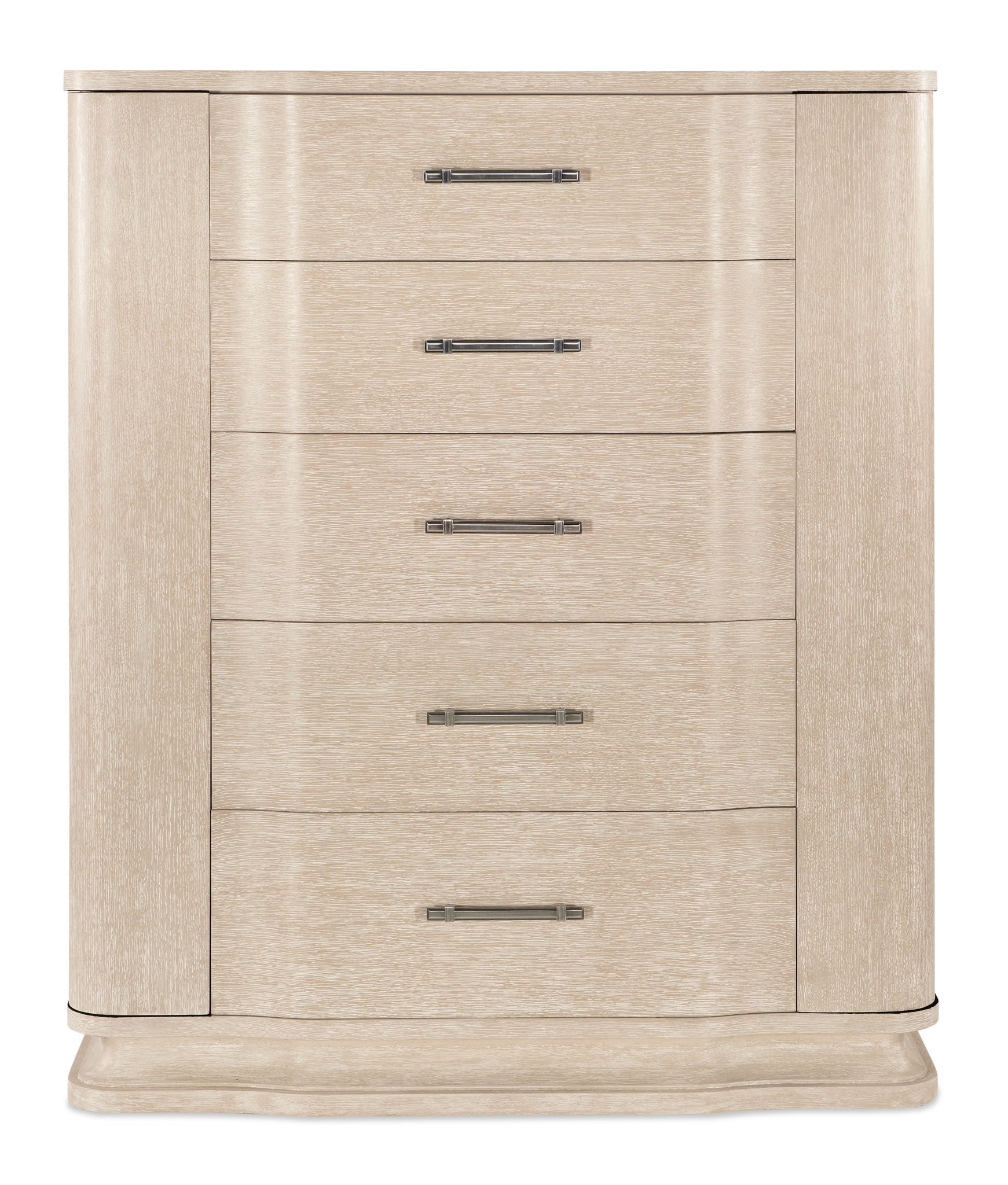 Unit price perWith a curved breakfront design and soft, flowing edges, the Nouveau Chic Five-Drawer Chest brings a clean neutral palette and casual modern style to your space. Crafted of Cathedral and Quartered Oak Veneers, it is finished in the serene Sandstone with light wire brushing. The stepped bracketed bar pulls in a nickel finish emulate the stepped-top dresser. A brilliant blend of fashion and function, the chest has two doors with soft-close hinges that open to reveal two felt-lined bars for hanging bracelets, 4 felt-lined fixed storage trays and 8 small black mesh bags and four large mesh bags for storing jewelry and other small items. Bottom drawer is cedar-lined.