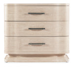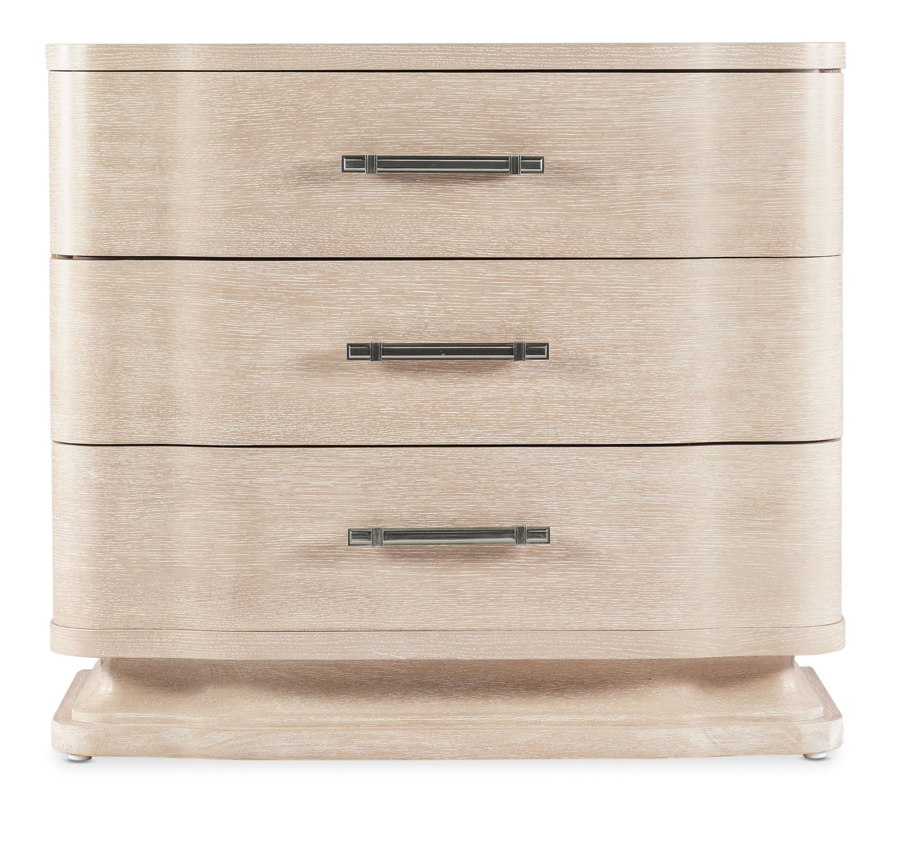 Unit price perWith a curved breakfront design and soft, flowing edges, the Nouveau Chic Three-Drawer Nightstand brings a clean neutral palette and casual modern style to your space. Crafted of Cathedral and Quartered Oak Veneers, it is finished in the serene Sandstone with light wire brushing. The stepped bracketed bar pulls in a nickel finish emulate the stepped-top of the case and plinth base. The drawers have cream-colored painted interiors and there are two USB charging ports and a cord clip on the back.