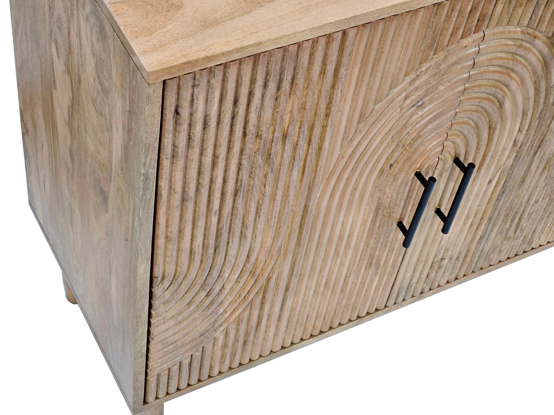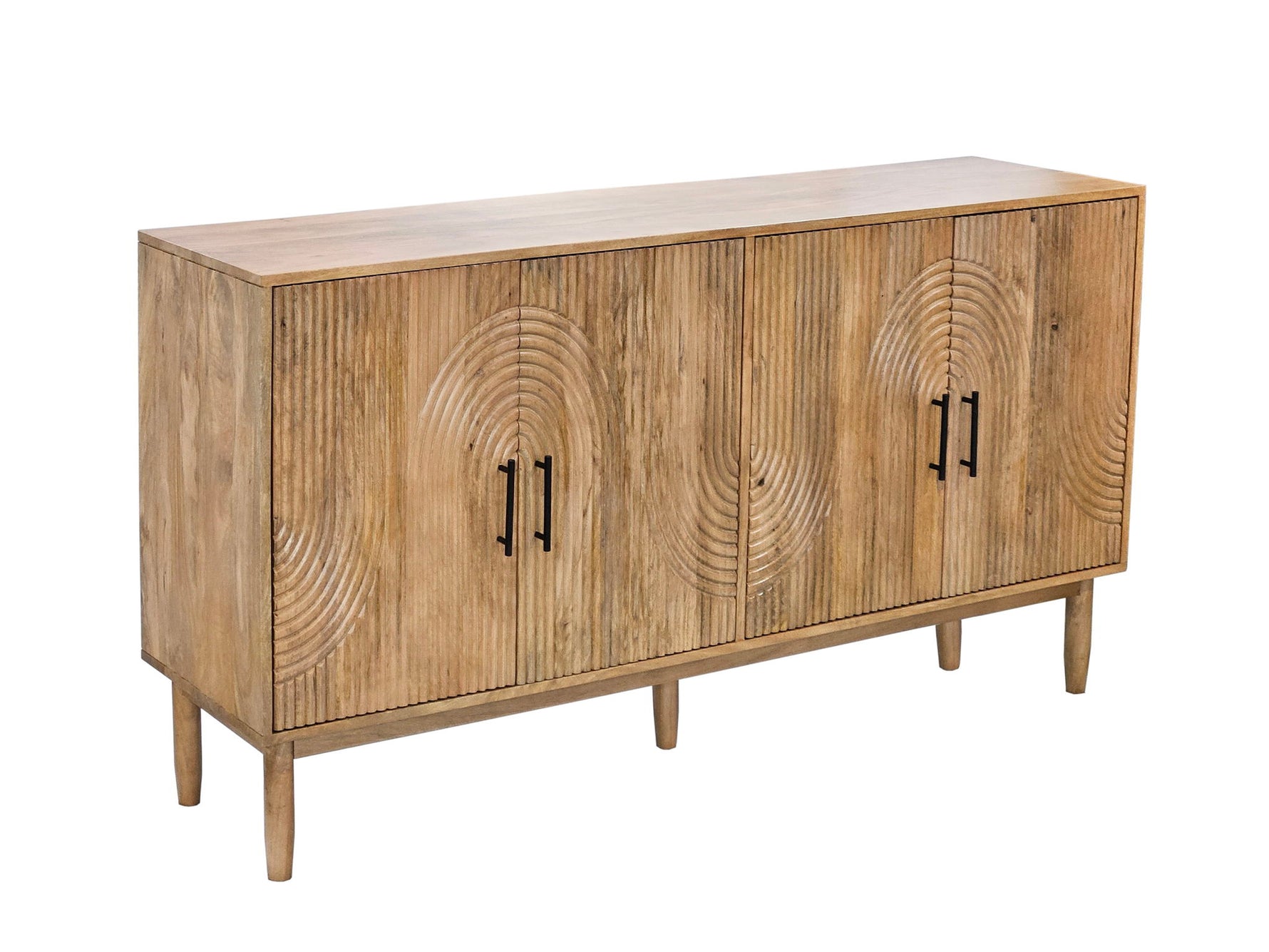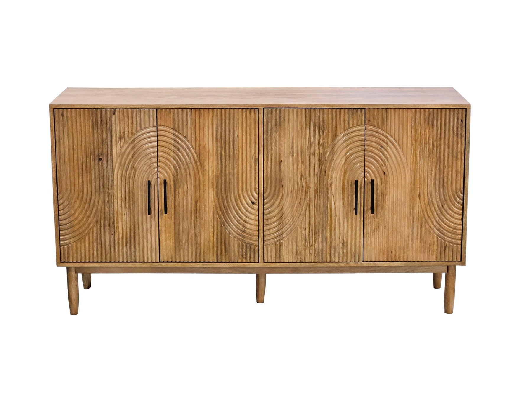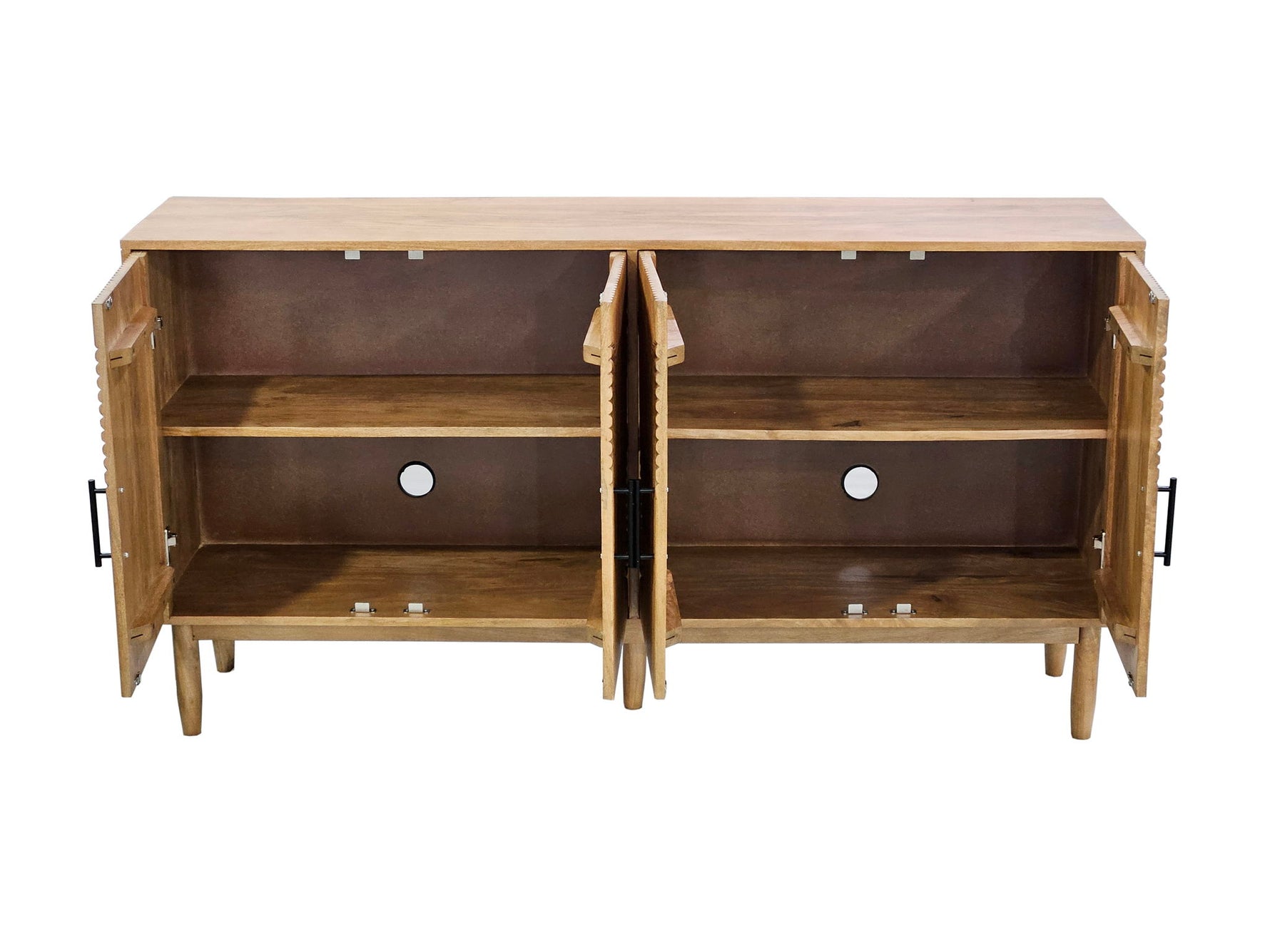 The Novak Server showcases a modern-inspired design, crafted from solid mango wood in a natural finish. The doors feature an organic reeded design, adding texture and visual interest, while the slim tapered legs elevate the piece for a sleek, contemporary look. Behind the four doors, you'll find adjustable shelves and media cord management, offering both style and practicality in a beautifully designed piece.
