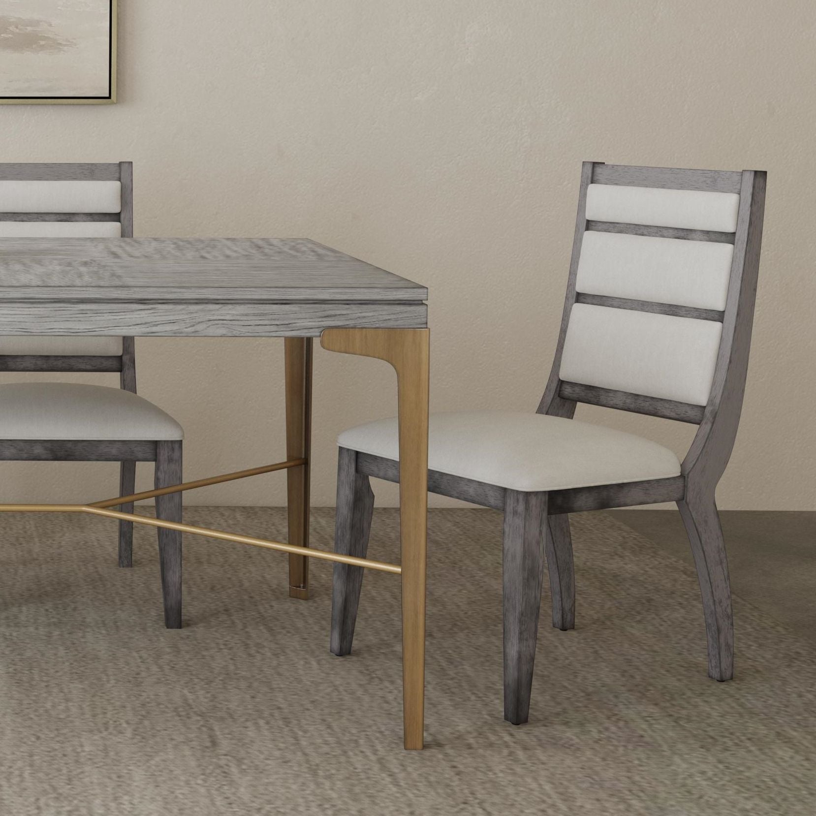 The Nylah Dining Chair has a modern glam styling with gray oak veneers in a platinum finish. Features a high upholstered back that alternates plush fabric channeling and wood slats. The upholstered seat and back are in an off-white fabric.