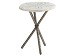 - The Sand Dollar End Table Pairs A Hammered Metal Base In Aged Pewter With An Inlaid Top Featuring A Sand Dollar Pattern Of Shells In Aquamarine, White, Ivory And Gray