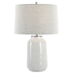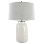 This Farmhouse Inspired Ceramic Table Lamp Features An Off-white Crackle Glaze With Subtle Horizontal Striped Detailing, Paired With Plated Brushed Nickel Accents. A Slightly Tapered Round Hardback Shade In Light Gray Linen Fabric Completes The Piece. Due To The Nature Of Fired Glazes On Ceramic Lamps, Finishes Will Vary Slightly.