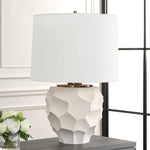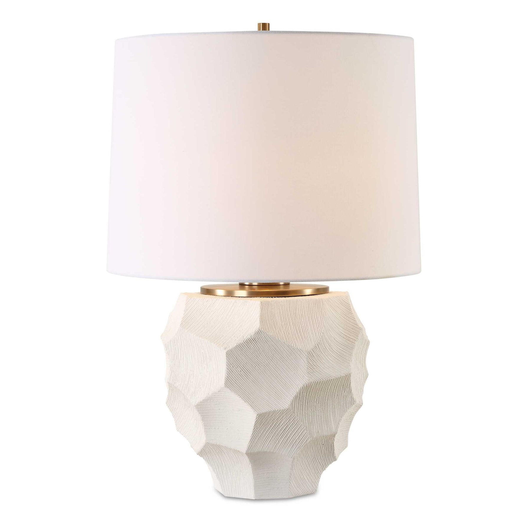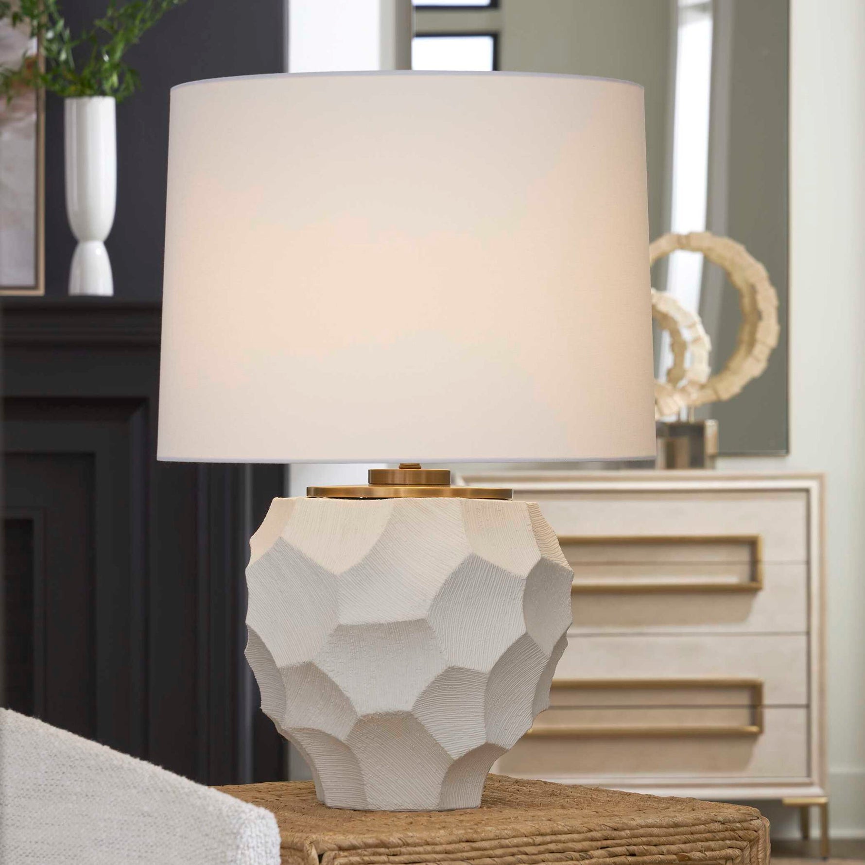 Featuring A Chunky Ceramic Base With Pronounced Ribbed Texture And Sharply Faceted Edges. Finished In A Subtle Chalk White Glaze And Accented With Plated Antique Brass Details. A Slightly Tapered Round Shade Made With A Crisp White Linen Fabric Completes The Piece.