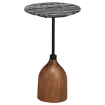 A compact profile makes maximum impact with impeccable design and luxurious materials. A contemporary side table is perfect for drinks, complete with a round top that acquits itself wonderfully in your living room. The top is made from beautiful black marble with distinctive veining that offers organic elegance and earthy character to sleek surrounding decor. The base is an inverted goblet, complete with a slim metal stem and warm brown mango wood cup that offers stability and artisan character. The intriguing combination of metal, stone and wood adds depth and dimension to a chic silhouette that finds a home in contemporary or modern farmhouse design.