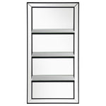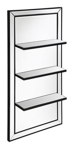 Present decor, bedroom essentials, and more along this modern glam wall mirror. Designed with an elongated, vertical mounting silhouette, this elegant wall mirror offers three narrow shelves to keep anything from perfumes to family photos. Covered entirely in a mirror tile, this wall mirror offers a dark tone edge that offers a defined contrast against the reflective mirror surfaces. A slim beveled edge along the outer mirror frame creates a classical aesthetic and hint of texture. Mount this wall mirror in a compact space to give the illusion of a more spacious interior.