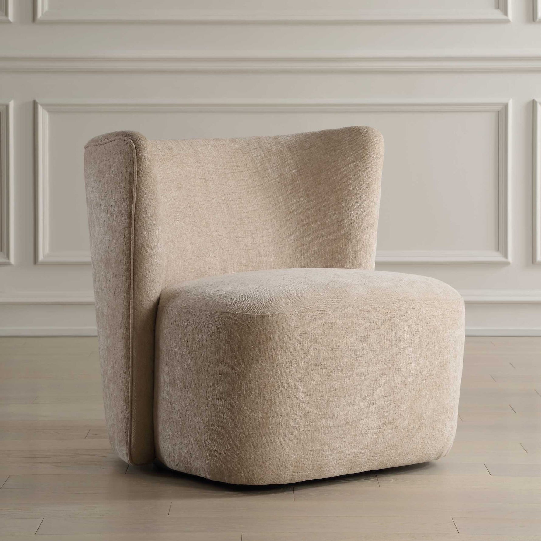 - Subtly Modern With A Unique Wrap Around Back With Inverse Angles, Atop A Hidden Swivel Base. Upholstered In A Finely Textured, Cleanable Polyester In Sand.