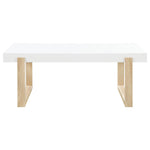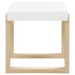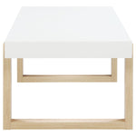 A spacious white high-gloss tabletop defines the modern appeal of this rectangular table. The thick square-edged surface rests within a sled-style base supported by dual U-shaped legs. Crafted from engineered wood, its bright hues contrast beautifully with the light natural finish of the base, highlighting its variegated wood grain pattern. Perfect for casual or contemporary spaces, this cocktail table adds charm and function, ideal for magazines, beverages, or decor in any living room.