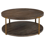 - The Palisade Coffee Table Is Finished In A Rich Coffee Finished Oak Veneer With Natural Wood Grain Details Accented By Forged Metal Columns Finished In Mottled Antique Gold.