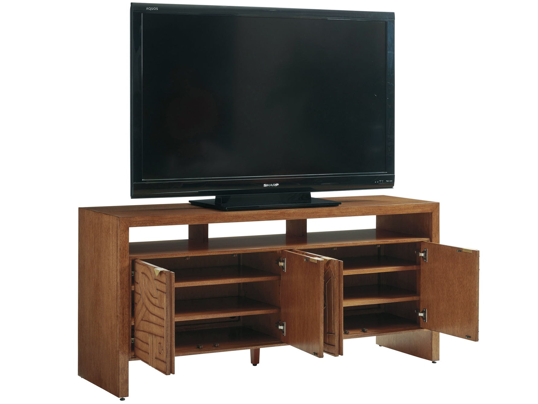 - Four Doors With Hand-applied Pencil Rattan Overlays, Four Adjustable Shelves, Grommets For Cord Management, And An Open Compartment 64w X 11.25d X 5h At Top To Accommodate A Sound Bar.