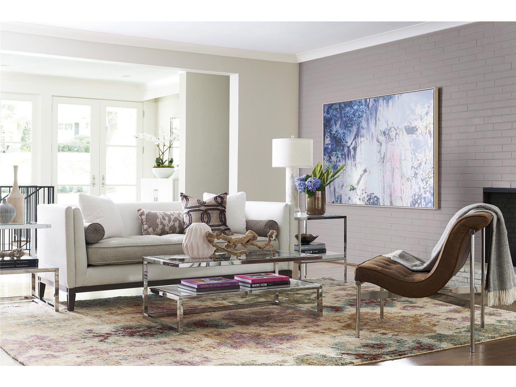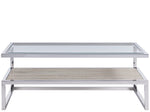 The Paradox Cocktail Table with Stone Shelf features the perfect pairing of a beveled clear glass top with an open stone display shelf, all encompassed by a sleek stainless steel frame.