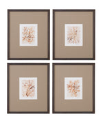 Parchment Coral is a four piece set of limited edition prints signed and numbered by the artist and printed on fine art cotton rag paper. These prints are framed in a 1" rustic black wash frame with a beige matboard.