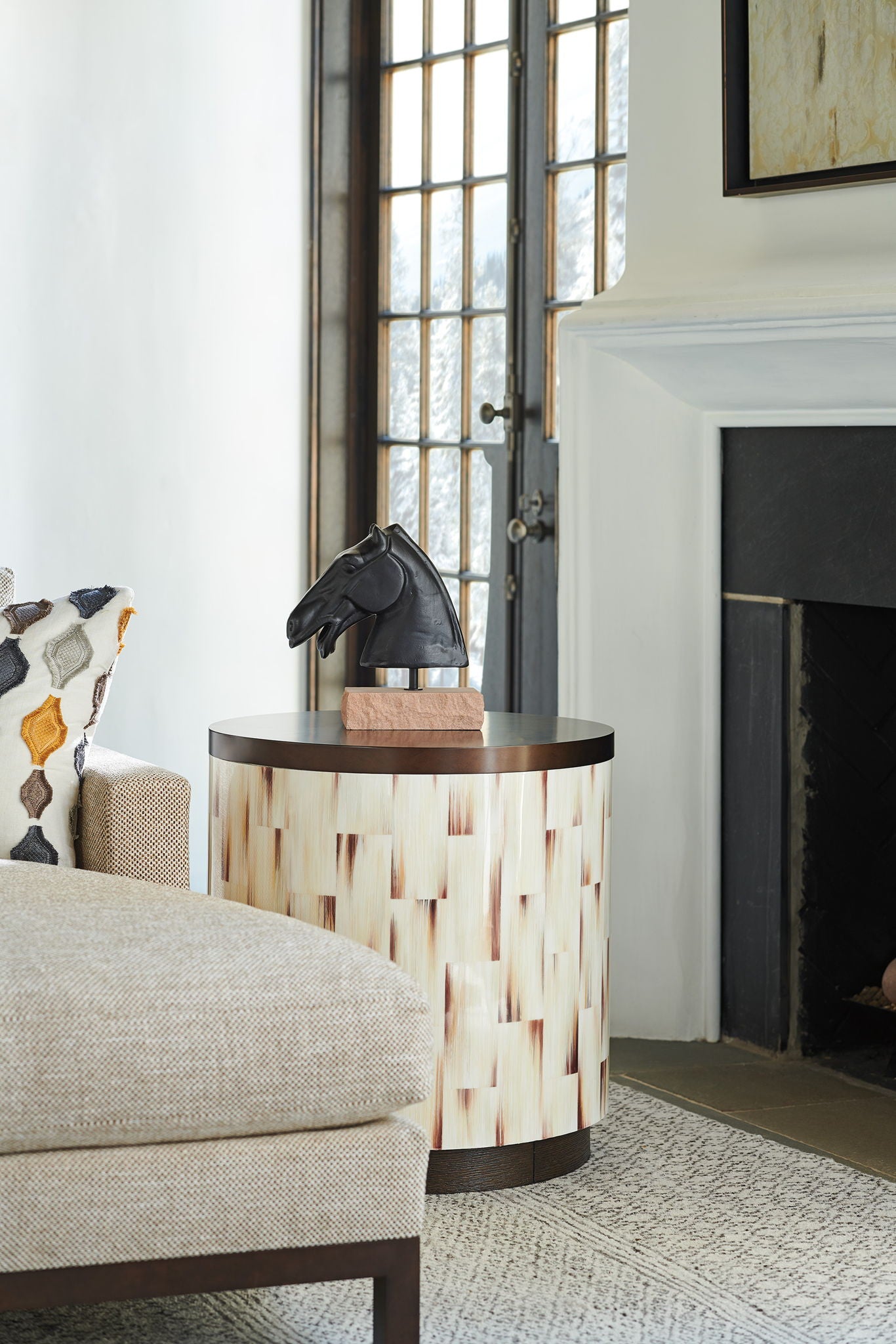 • The 22-inch Diameter Commode End Table Features A Burnished Bronze Finished Metal Top, Faux Horn Design On The Cylinder And Recessed Plinth Base For An Exceptional Designer Look.