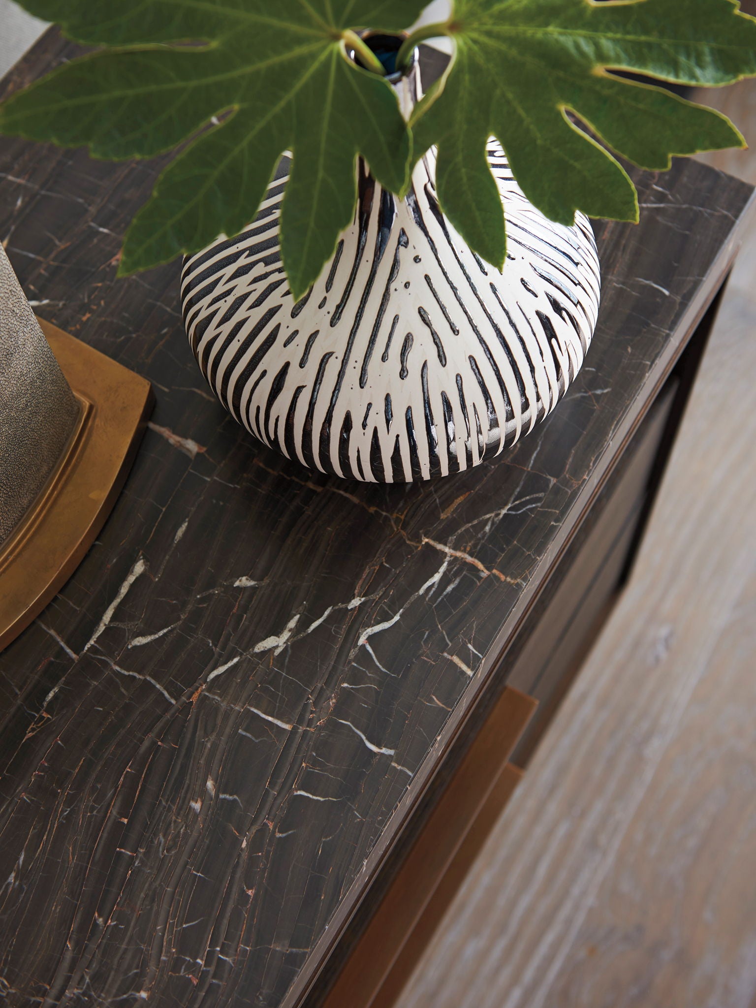 The exceptional design includes an Alpine marble top floating over a metal frame