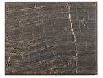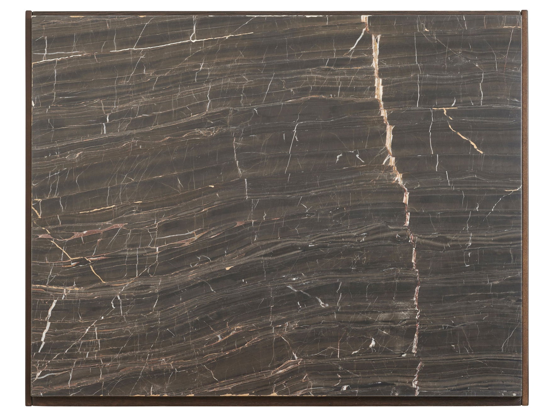 • The Summit End Table Has A Burnished Bronze Metal Frame On The Front And Back With An Alpine Marble Top And Stationary, Adjustable Glass Shelf