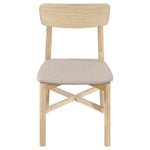 Bring a touch of simplicity and comfort to your dining space with this stylish chair. Designed with a minimalist appeal, the chair is crafted from a mix of solid wood and engineered wood for both durability and a natural aesthetic. The tan fabric upholstered seat, padded with foam cushioning, provides a soft and comfortable place to sit, making it ideal for long dinners and casual gatherings. The rounded backrest adds an organic, contemporary vibe, complementing the overall light, airy look of the chair.