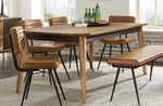With a retro flair and minimal silhouette, this dining table makes a lovely furniture piece to a modern farmhouse style home. Made of solid sheesham wood and hand crafted, the table features a warm natural finish that complements many color palettes and lends an earthy vibe. Surrounding the table just below the top is an apron with a black chevron pattern design that brings an art deco touch and contrast. Four straight, tapered legs offer an elegant quality. Also available in this Partridge collection is a matching chair, bench, and dining server to complete an entire dining room ensemble.