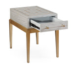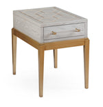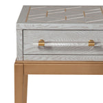 The Perrine Chairside Table will make the perfect addition for your home. The gold legs pop against the soft graphite gray table top. The top is accented with antique gold geometric inlay design, and custom acrylic hardware for the draw pulls.