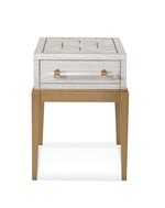 The Perrine White Accent Table showcases versatile transitional styling. With a soft white finish on flat cut oak veneers, it brings a sense of elegance to your space. Its top features a satin brass geometric design, echoed by the satin brass base and acrylic bar pulls with satin brass accents on the single drawer. The combination of finishes and materials adds charm and character to this trustworthy piece of furniture. It's a delightful addition to your home, marrying style and function seamlessly.