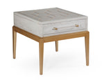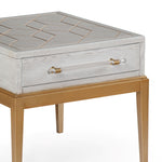 The Perrine Rectangular End Table will make the perfect addition for your home. The gold legs pop against the soft graphite gray table top. The top is accented with antique gold geometric inlay design, and custom acrylic hardware for the draw pulls.