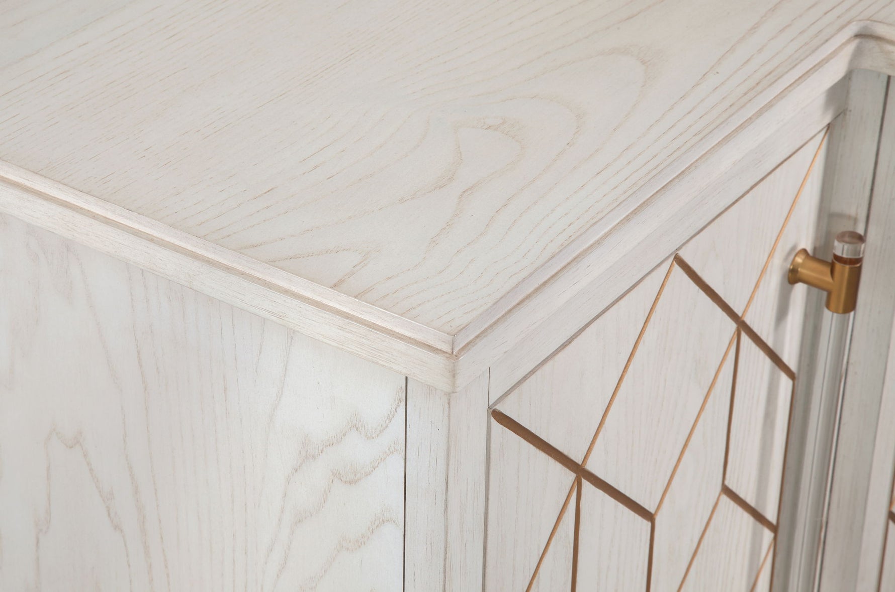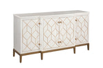Meet the Perrine White Server, a fine example of modern glam design. With its four doors featuring a geometric carved design highlighted by a gold finish, it showcases a blend of artistry and functionality. Inside, you'll discover two shelves behind each door, and the center provides a convenient drawer and shelf. The soft white finish, satin brass accents, and clear acrylic elements make it a distinctive addition to your home. The Perrine White Server combines style and practicality to enhance your decor.