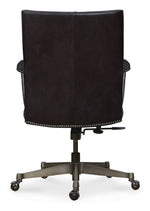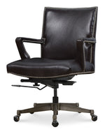 The Phoenix Executive Swivel Tilt Chair in Graphite leather combines industrial modern aesthetics with superior comfort. Its leather-wrapped open-arm design, nailhead trim, and gunmetal base create a striking look for any home office. Durable and sophisticated, this chair offers both form and function with black nickel casters for ease of movement.