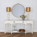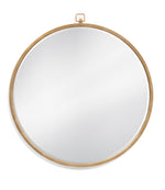 The Logaan Round Wall Mirror, adorned in gold leaf, features a sleek pocket watch bow detail, seamlessly blending modern and traditional styles. Its metal frame, finished in gold leaf with a square edge, adds a touch of sophistication to any space. With a beveled edge and square hanger, this mirror is both stylish and functional, enhancing the ambiance of your room effortlessly.