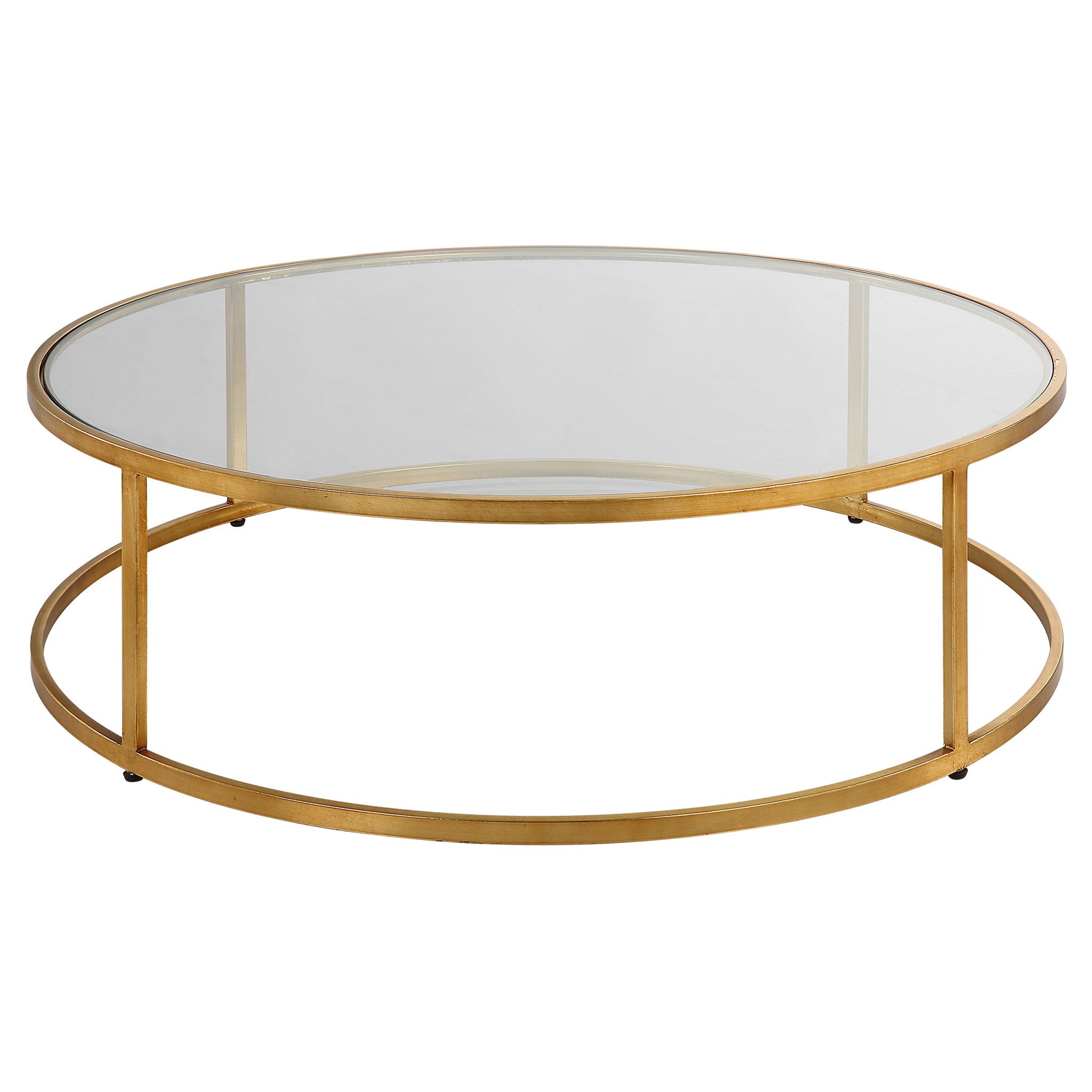 - A Complement To Any Modern Space, The Radius Coffee Table Features An Iron Frame Finished In Lightly Antiqued Gold With A Clear Glass Top.