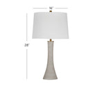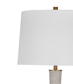 The Ranier Table Lamp, with its gray textured resin body and brass accents, brings contemporary elegance. The fluted base adds a stylish touch, complemented by the tapered drum-shaped lamp shade in white linen. With a 3-way turn knob switch and a 60-inch cord, it ensures easy and versatile placement in your space.