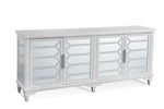 The Reid Server embodies a sleek and modern style, designed to enhance your living space. It showcases a smooth white painted finish and clear glass mirror door fronts, elegantly accented by brushed nickel oversized vertical door pulls. The exterior features a captivating geometric wood and clear glass mirror design, making it both stylish and functional. With four doors that open to two cabinets, each equipped with an adjustable shelf, it provides ample storage. Additional features include soft-close hinges, magnetic door stops, adjustable floor levelers, wire management cutouts, and convenient hand cutouts for easy mobility. A practical and chic addition to your home decor.