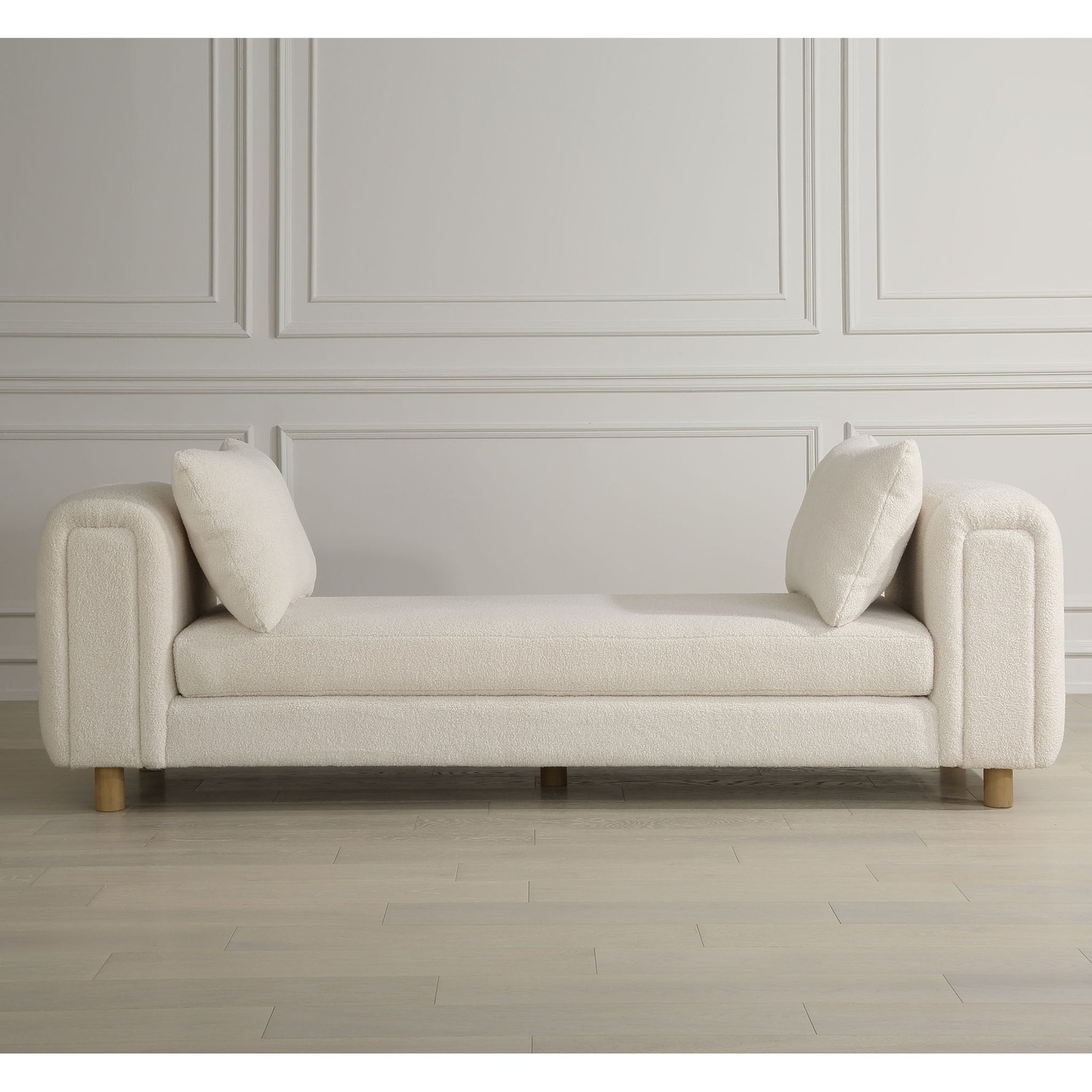 - Exceptional Comfort With Dual Functionality As An Oversized Bench Or Even A Small Day Bed, Featuring Chunky Curves And Dowel Feet In Light Oak, With Two Accent Pillows. Upholstered In A Finely Textured Faux Sheepskin In Soft Ivory.
