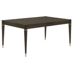Enhance your dining experience with this contemporary dining table in a stunning ash brown finish. Crafted with a combination of engineered wood, Asian hardwood, and ash veneer, it delivers durability and timeless elegance. The table extends from 63 inches to 81 inches with a removable extension leaf, offering flexibility for intimate dinners or larger gatherings. Metal-capped tapered legs and subtle metallic accents elevate the design with a modern touch. Perfectly suited for any dining setting, this table blends functionality with stylish appeal.