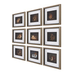 Resting Bunny Framed Prints Feature Nine Individual Antiqued Rabbit Illustrations, Each Framed In A Warm Wood Grain Frame Surrounded By A Matching Black Rabbet And Causal Linen Liner. This Charming Collection Adds A Touch Of Rustic Elegance And Whimsy To Any Space. Artwork By Marian Parsons.