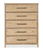 Inspired by tropical getaways, the Retreat Pole Rattan Five-Drawer Chest is a blend of natural materials in a laid-back, versatile design. Crafted of Oak and Maple Veneers with Rope accents, the chest is finished in the sand-colored, transparent by design to reveal the unique grain patterns in the wood veneer. Offering five self-closing drawers, the top drawer has a removable felt liner and the bottom drawer is cedar-lined. The textured, pewter-colored bar pulls add a look of natural elegance.
