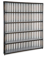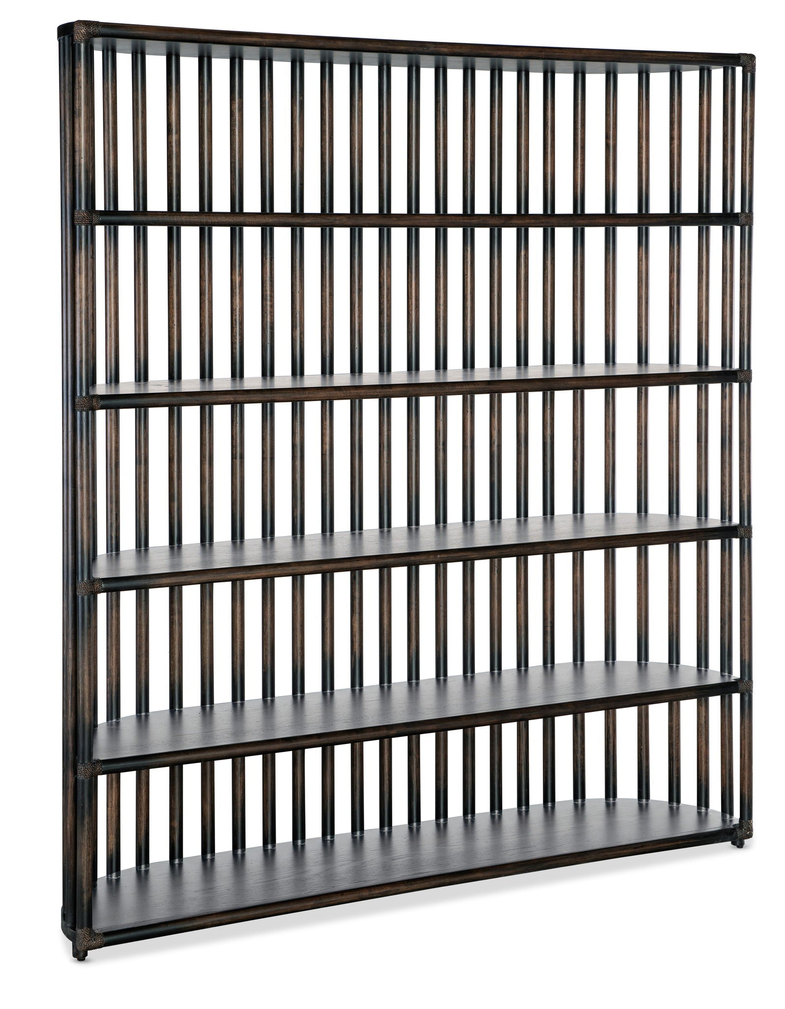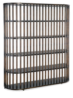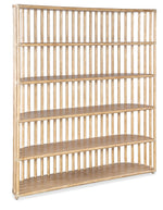 Tranquil with a modern twist and clean lines, the Retreat Slatted Bookcase defines and declutters your space. Featuring four fixed shelves, a slatted back and curved sides, it has rope accents. Finished on all sides so it can float in a room, it is crafted of Oak Veneers in the Dune sand-colored finish, transparent by design to showcase the unique wood grain patterns. The finish is inspired by light sand and the smooth shore after a receding tide.
