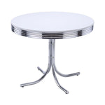 Add nostalgic flair to your dining space with this round retro dining table, featuring a crisp white top and chrome-rimmed edge. Supported by curvaceous chrome metal legs, this table delivers mid-century diner charm with a modern twist. Ideal for breakfast nooks, game nights, or casual meals, it’s a fun and functional piece that brings vintage energy into any setting.